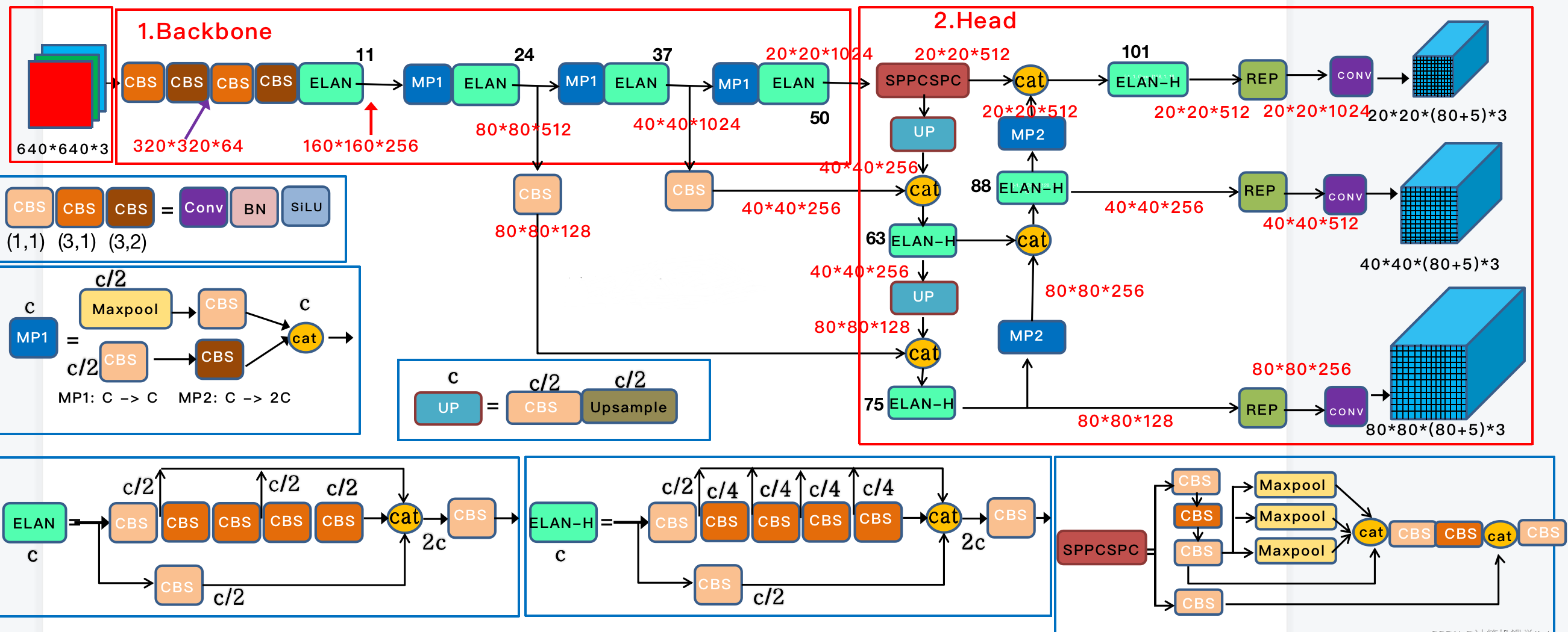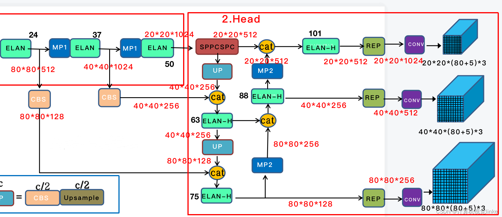 backbone的基本组件就介绍完了,我们整体来看下 backbone,经过 4 个 CBS 后,接入例如一个 ELAN ,然后后面就是三个 MP + ELAN 的输出,对应的就是 C3/C4/C5 的输出,大小分别为 80 * 80 * 512 , 40 * 40 * 1024, 20 * 20 * 1024。 每一个 MP 由 5 层, ELAN 有 8 层, 所以整个 backbone 的层数为 4 + 8 + 13 * 3 = 51 层, 从 0 开始的话,最后一层就是第 50 层。