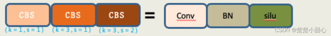 对于CBS模块,我们可以看从图中可以看出它是由一个Conv层,也就是卷积层,一个BN层,也就是Batch normalization层,还有一个Silu层,这是一个激活函数。