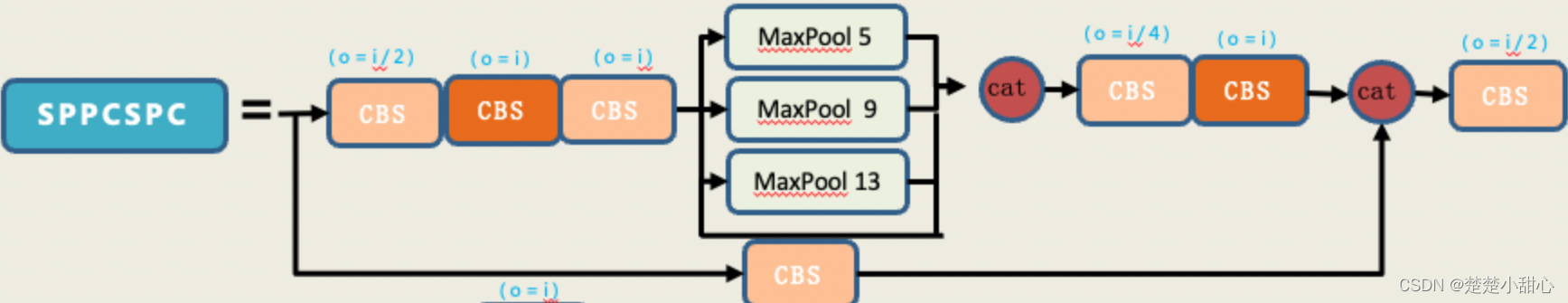 从架构图中我们可以看出,CBS模块这里有三种颜色,三种颜色代表它们的卷积核(k)和步长(s)不同。