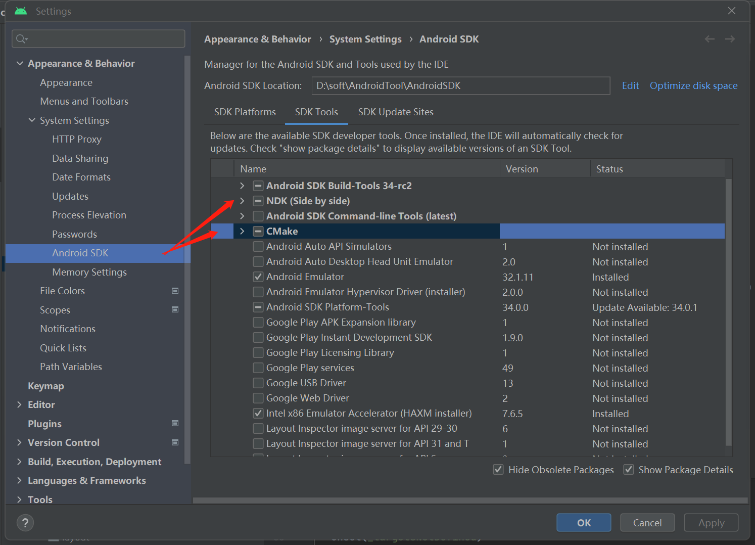 - 设置你的android的版本,选择兼容的NDK和CMake,这里我选择的NDK是21.3.6528147,CMake是3.10.2.4988404(调了一下午,才找到与gradle版本不冲突的NDK和CMake版本)